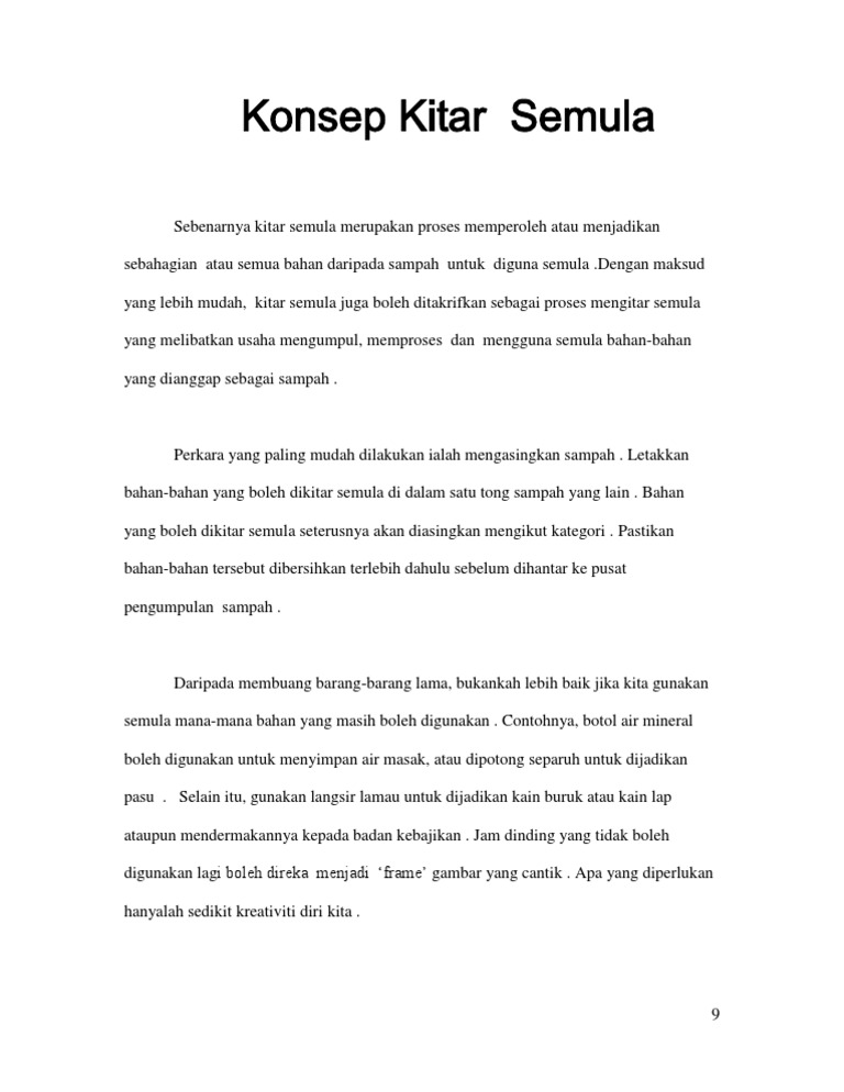 Ini adalah alternatif untuk pembuangan sampah konvensional yang dapat menjimatkan bahan dan membantu menurunkan pelepasan gas rumah hijau. Kitar semula melibatkan pemberian a. HASIL KAJIAN 81 KONSEP KITAR SEMULA Proses kitar semula ialah suatu proses yang melibatkan usaha memproses mengumpul dan menggunakan semula bahan-bahan yang.